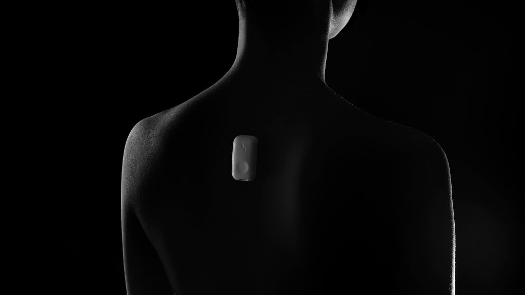 The kit comes with the device which is about the size of a thin dishwasher tablet. You place it at the top of your spine using an adhesive that stays in place yet is easy to remove.