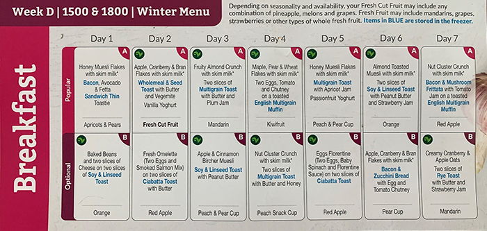 Four of the five breakfasts also included a serve of cereal, but as someone who doesn’t really enjoy cereal I didn’t eat it. For the same calories I would have preferred a larger portion of the main meal.