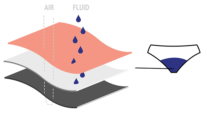 Although the exact design varies between products, period undies generally have a moisture-wicking top layer, over one or more absorbent layers in the gusset, and a leak-resistant final layer. Some brands also have an extra middle layer designed to neutralise odours.