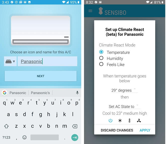 The first feature you may want to set up is ‘Climate react’ – using the Sensibo’s inbuilt temperature and humidity sensors, you can control your air conditioner’s actions based on the ambient temperature of the room. For example, you may want to set your air con to turn on when the room temperature reaches 28 degrees and a certain humidity level, and turn off again once the temperature drops below 24 degrees.