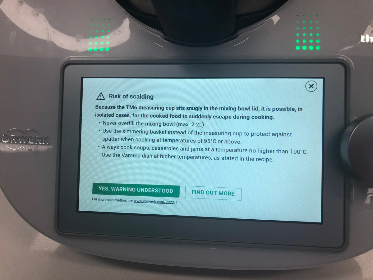 This situation does not arise if a TM5 measuring cup is used, as the measuring cup for the TM5 sits loosely in the lid of the mixing bowl. Users of a predecessor model should check if they are using a TM6 measuring cup. If you own a TM5 and have never upgraded your measuring cup to a TM6, then the warning won’t apply.