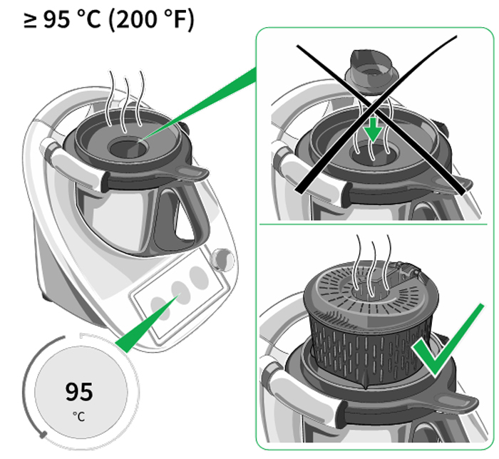 The simmering basket must be used instead of the TM6 measuring cup when cooking at temperatures of 95°C / 200°F and above.