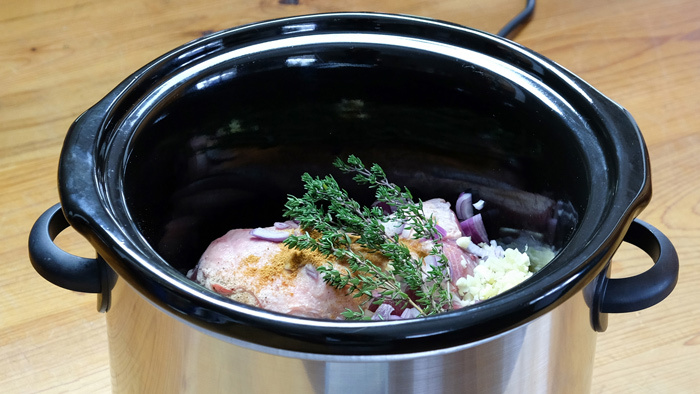4. Make sure the meat is pushed into the liquid. Cook in your slow cooker for 5–6 hours on high setting or 8 hours at the low-heat setting.