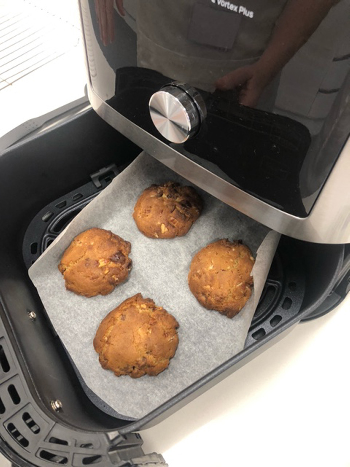 This recipe will cook about six cookies at a time as we used a larger-capacity air fryer. The key is not to crowd the tray. For best results you should leave approximately 2cm space between each cookie.