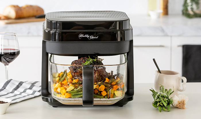 Some air fryers, such as this Healthy Choice model, now have glass baskets as an alternative to plastic. Image credit: Healthy Choice.