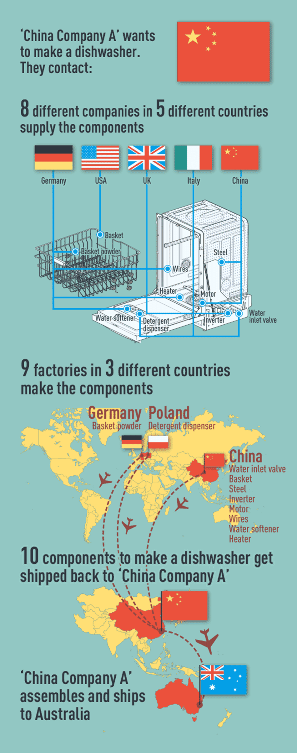 ‘China Company A’ wants to make a dishwasher. They contact eight different companies in five different countries to supply the components:
