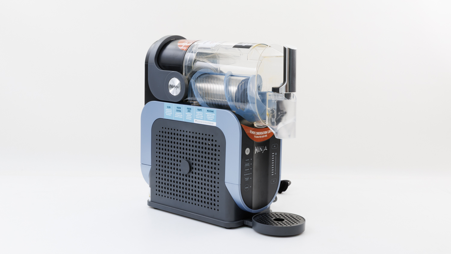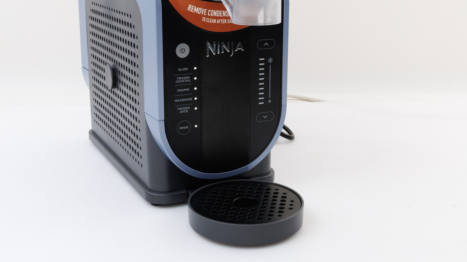 The condensation tray also needs to be cleaned. It sits under the vessel and catches all the drips as the vessel gets cold and condensates. It’s easy to remove but must be cleaned after each use, especially if the Slushi has been left on for a while.