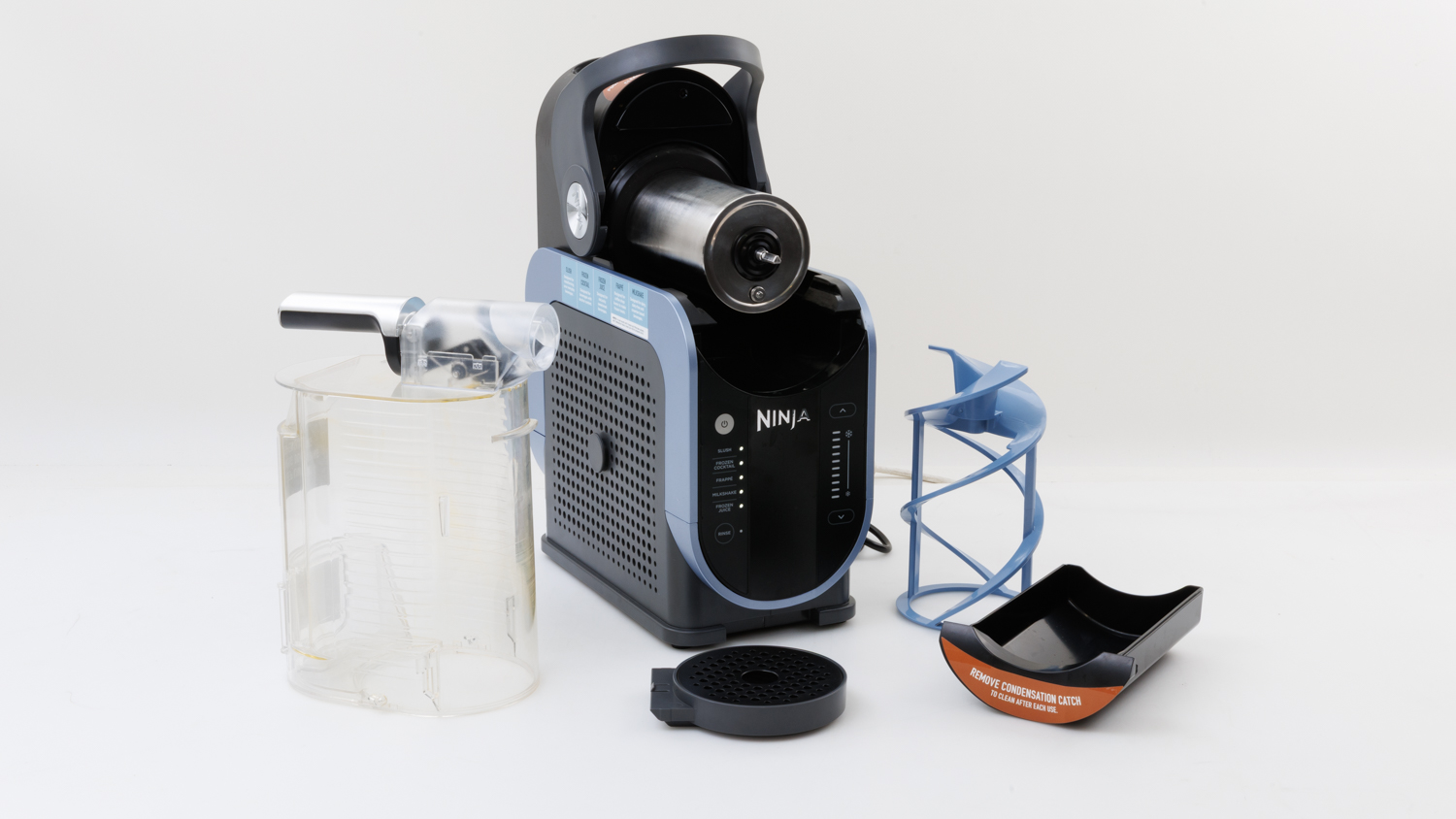 The Ninja Slushi comes with a liquid vessel, auger, condenser tray and drip tray.