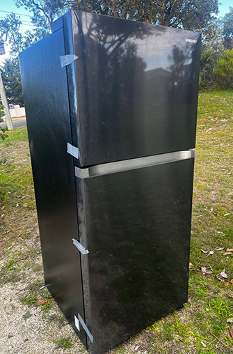 The Samsung fridge, which the family is keeping in a shed until there is a resolution.