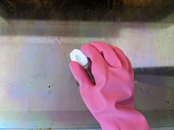 First, snap on some rubber gloves. Then, dip a powder-based tablet into warm water and rub it across the interior pane. Keep dipping and rubbing until the tablet has fully dissolved (don’t be alarmed by the brown sludge that forms). Once it has, use kitchen paper or a microfibre cloth to remove the residue. Rinse and repeat until your glass is sparkling.