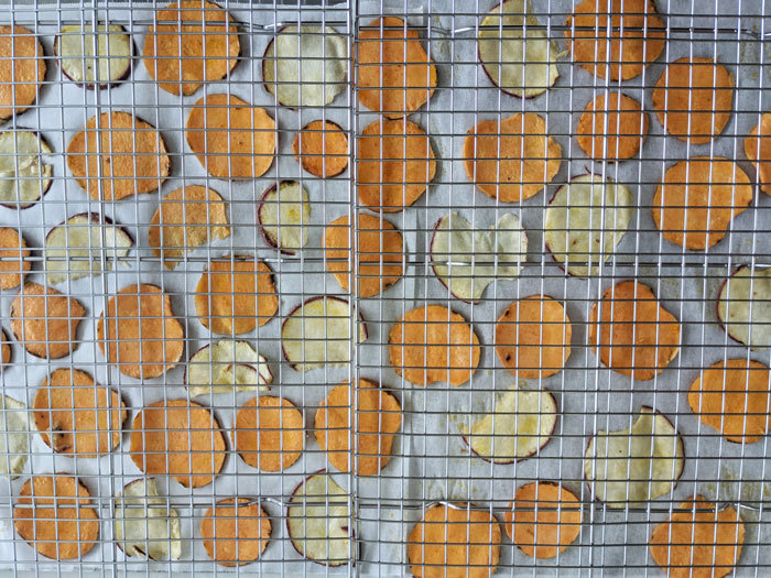 Sweet potato chips cooked on stacked cooling racks. Stacking means you can cook more.