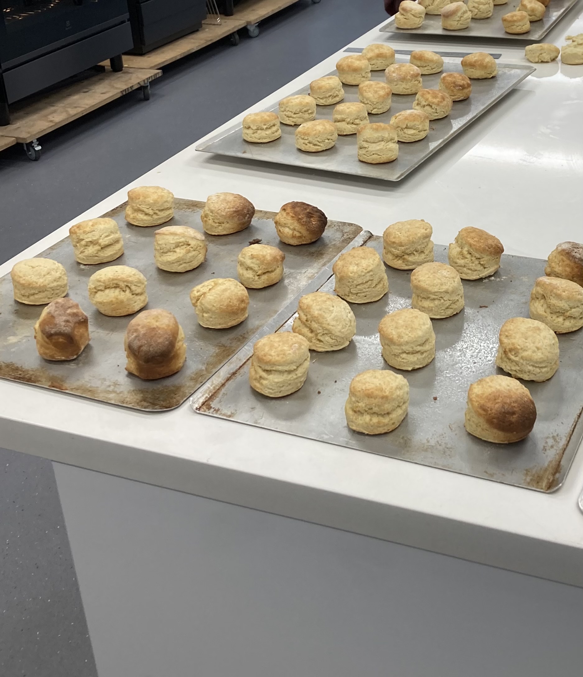 She pops two trays of scones into the oven on different shelves, then compares how evenly browned they are, plus the evenness of rising, height and crumb tenderness.