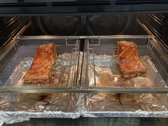 Cooking roast pork in the oven using the air fryer function with air frying oven accessories.