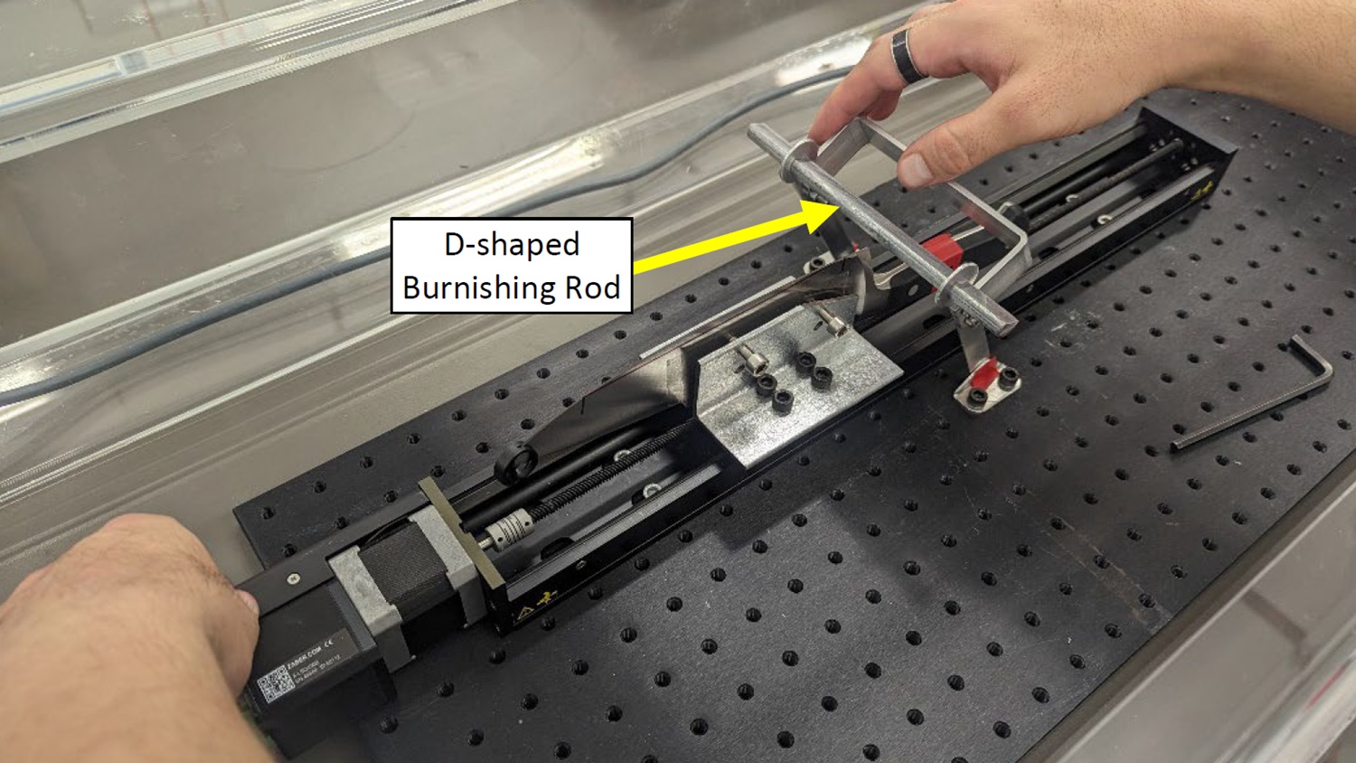 This simulates wear and dulling that occurs during normal use (for example, chopping vegetables). The knife is mounted on the same actuator stage then run along a D-shaped, 12mm galvanised steel rod at a constant load of 150 grams. This moves the knife through 50 burnishing stroke cycles, with stroke lengths of 160 mm.