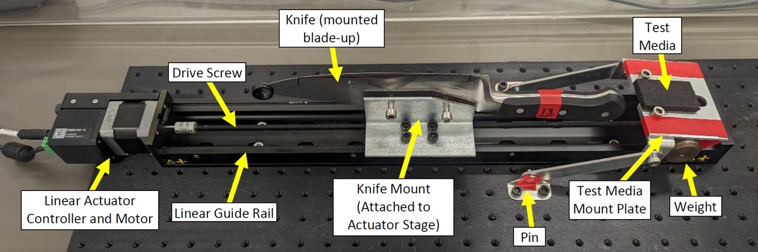 Each knife is mounted on an actuator stage with a constant load of 760 grams applied for the cut. Ethylene-vinyl acetate foam is mounted in place for the blade to slice through. This is used due to its high homogeneity, which ensures consistent results throughout the testing process.