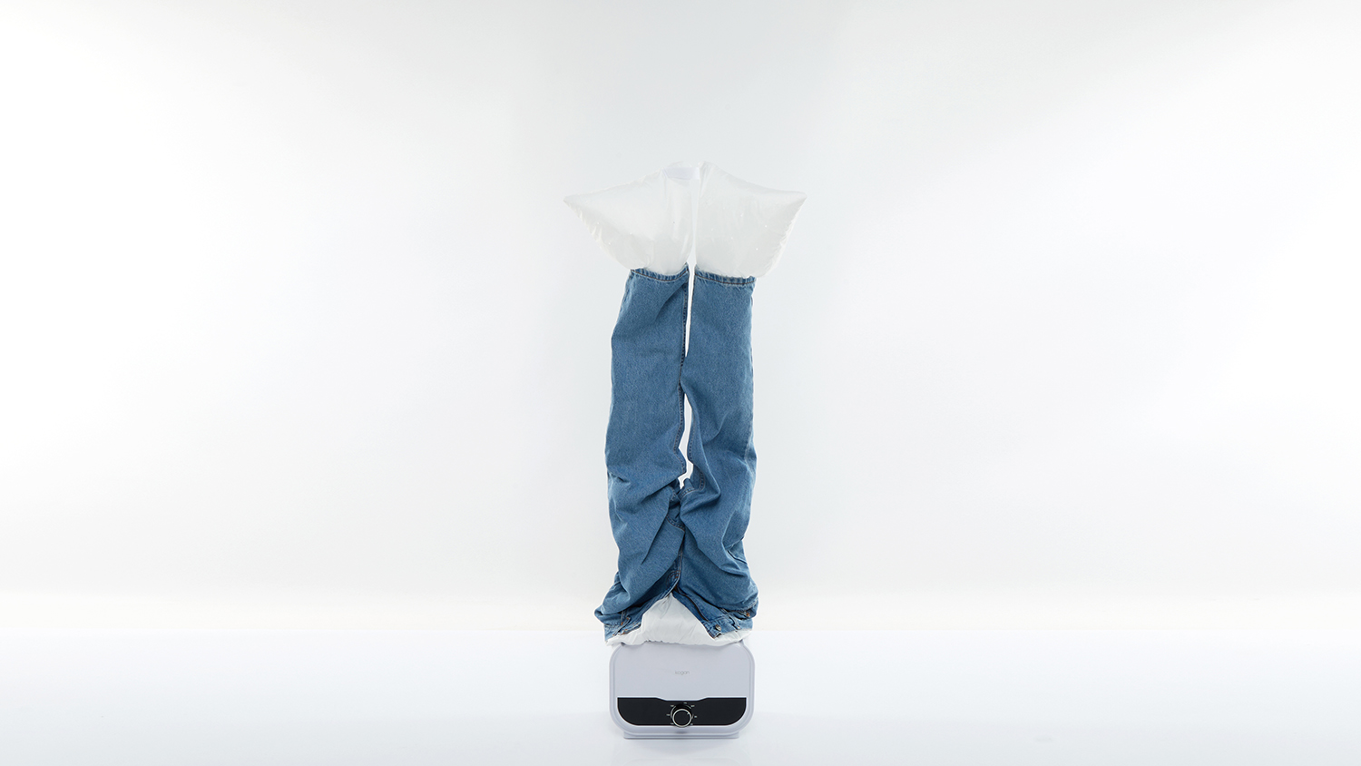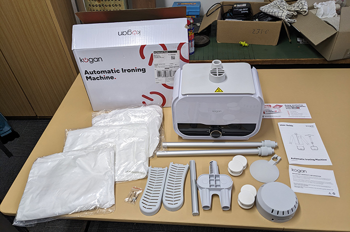 The Kogan Hands-Free Automatic Ironing Machine includes a main unit to blow hot air, three specially shaped nylon material casings and a central bracket that can be attached in various configurations to dry and take creases out of your trousers, shirts and even wet sneakers.