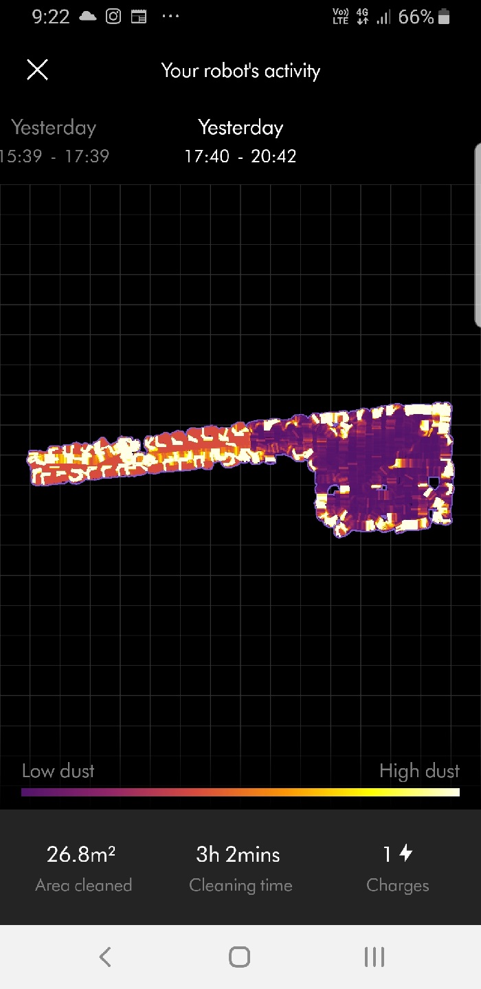 Connecting the associated MyDyson app to the 360 Vis Nav was easy – we scanned the QR code on the robot and followed the on-screen instructions to set up an account (your name and email address are required). One of the interesting features on the app is that it shows ‘dust maps’ of your home, and highlights how intense the dust levels are.