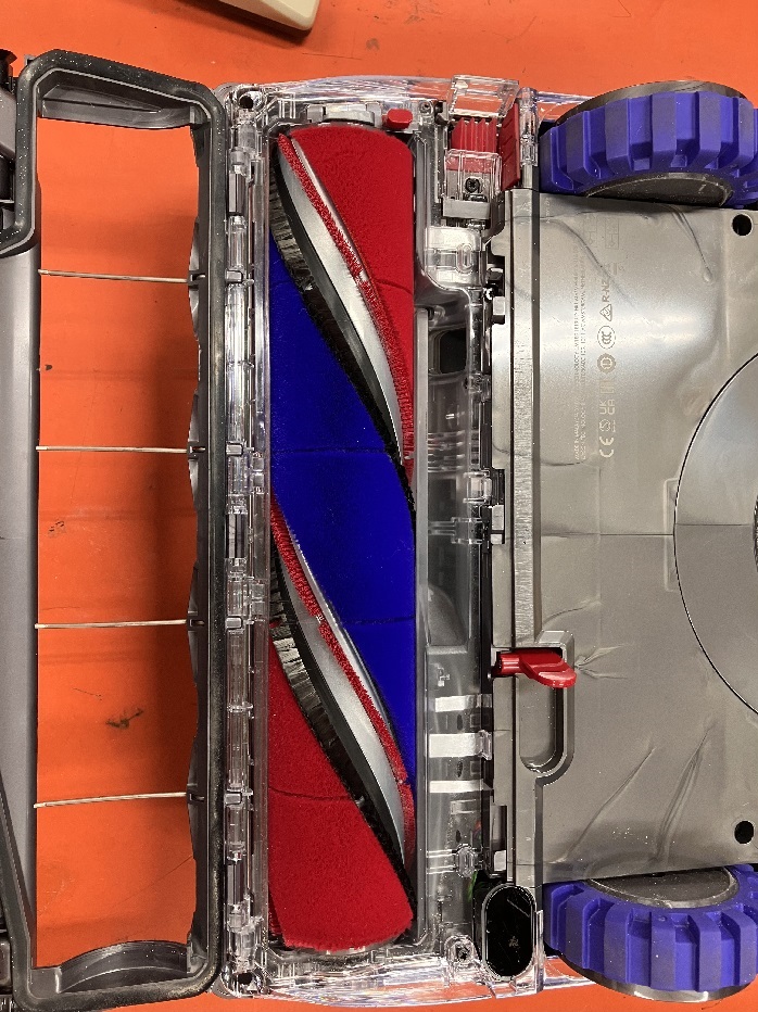 Underneath the unit, the long brush bar combines soft, fluffy nylon (to collect hard floor debris) with stiffer nylon bristles (designed for carpet).