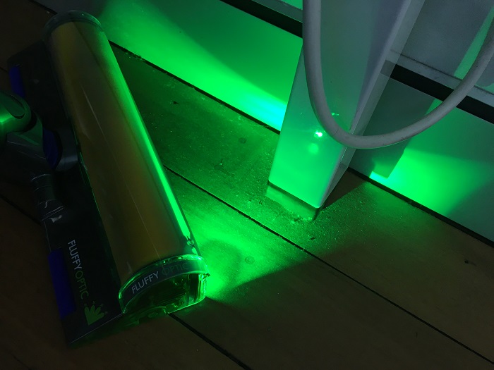 A green optic LED highlights hard-to-see dirt on your hard floor. The light is brighter than the V15 Detect’s laser in bright conditions, but you still see more in the dark.