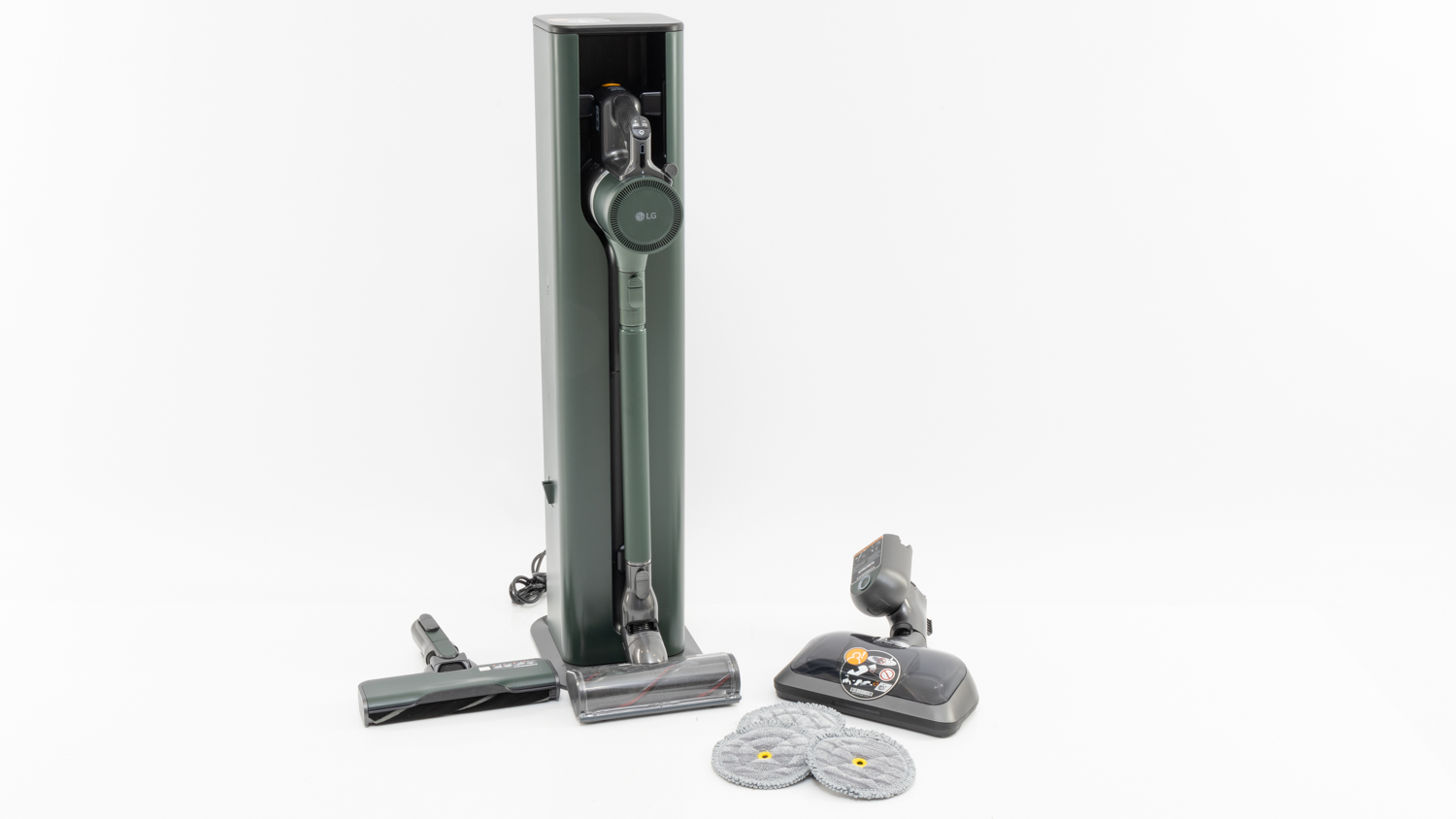 The LG CordZero A9T-Max, for instance, comes with three power heads, a power mop head, combination dusting brush/upholstery tool, crevice tool, cleaning tool, extra filter, mop heads, measuring cup, battery charger, extra battery (more on that later), tool holder and a self-emptying charging station.