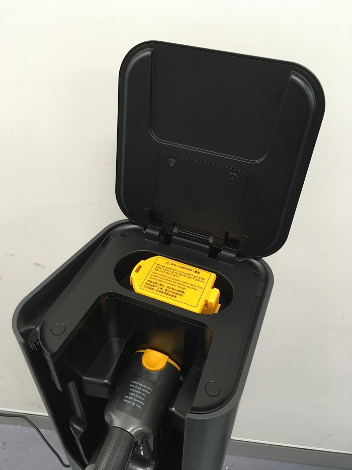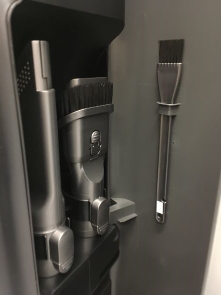 You simply open the ‘doors’ of the unit and store the required accessories at each side. The spare battery (which sits at the top of the unit) gets charged once the stick vacuum battery is charged, so you don’t have to worry about losing power halfway through a cleaning job. It takes about four hours to charge each battery.