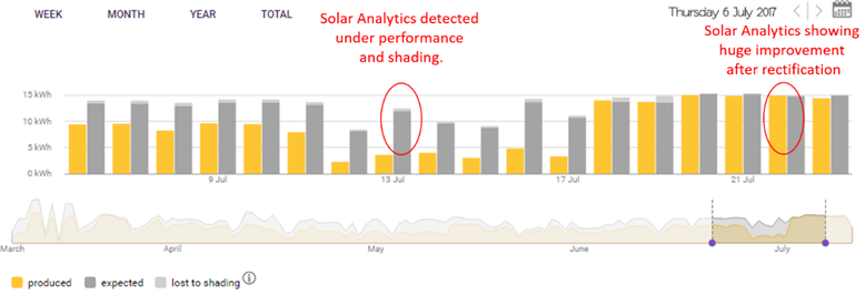 The Solar Analytics graph from the dashboard of a family home shows the daily electricity used (over a month) through each monitored circuit in the household, as well as the solar electricity produced.A snapshot from a Solar Analytics Monitoring dashboard for a motorbike retail shop. The grey bars show how much electricity the solar panels should be producing, according to the analysis of weather and other data by the SA system. The yellow bars show the actual output. Without monitoring, the deficit would not have been so obvious, except for an increase in the electricity bill. The deficit was due to a shading (overshadowing) issue, which was rectified by 18 July and performance then matched the system’s expectations.The graph shows the expected savings from the solar output (delivered through a feed-in tariff for solar sent to the grid, and solar consumed on the site avoiding drawing from the grid) and the actual savings. In this case, expected savings were more than real savings, which would indicate that the solar PV system is under-performing.