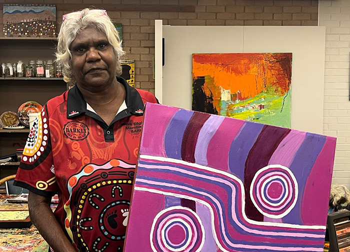 At Barkly Regional Arts across town, a group of elderly women sit around a big table or on mats on the floor, painting works of art. For Mary James, who comes almost every day, it is a therapeutic practice she has enjoyed for years, and it also earns her a little money.