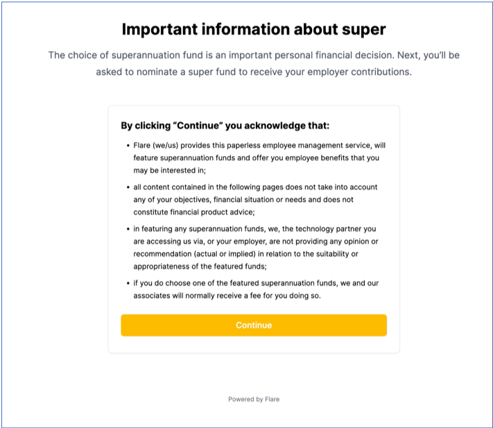 Screenshot from the MYOB onboarding software that shows how their preferred featured funds are more prominently displayed.The software asks you to nominate a fund, even if you already have one.Screenshot from MYOB onboarding software titled ‘Important information about super’.
