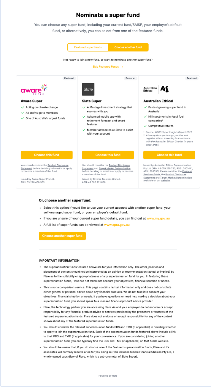 A CHOICE staff member also obtained a demonstration of the onboarding platform. In the demonstration, the user had to click through Slate Super and another fund that had paid to be featured before being given the option to stay with their existing fund. The CHOICE staff member felt a user might need to be familiar with superannuation guidelines or read the information presented thoroughly in order to know that they can retain their current fund.