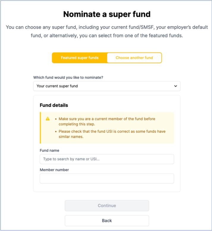 If the user wants to keep their current fund, they enter the fund’s name or Unique Superannuation Identifier (USI) and their member number. This contrasts with the reforms to super introduced in 2021 that allow ‘stapling’ – to ensure your super moves with you from job to job, so you can simply do nothing – no forms, no looking up member numbers – and still retain your current fund.