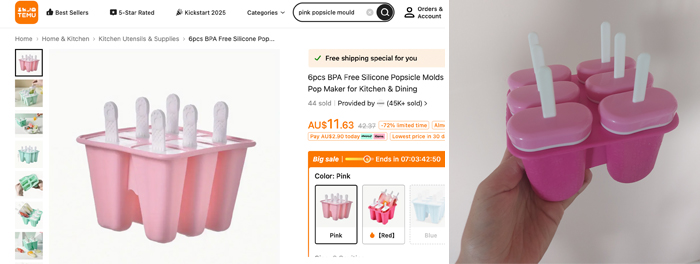 LEFT: Temu sells these popsicle molds for just over $11 each – shipped from China. RIGHT: I got this cute set from my local op shop for $2.