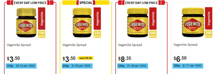 Unit prices can help you compare different pack sizes of the same product to see which offers the best value. Here we can see that the largest jar size of Vegemite has the lowest unit price.