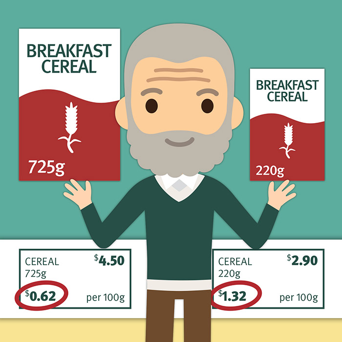 “Is a big pack of cereal more cost effective than a small pack for your family, or is a small pack of another brand on special this week better value? Unit pricing makes it easy for you to decide.”