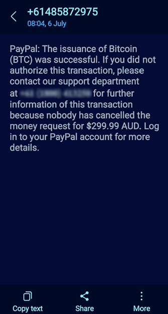 A PayPal user who alerted CHOICE to this latest con says they called the number included in the message they received, and the person who answered told them to share their credit card and other information to cancel the Bitcoin transaction.